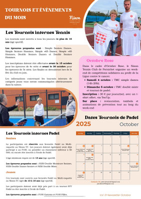 À partir de ce mois-ci, une newsletter vous sera envoyée aux adhérents au début de chaque mois. Elle permettra de suivre de près la vie du club, avec un aperçu des événements et tournois programmés, la mise en avant d’un partenaire et des avantages qu’il propose aux membres, ainsi qu’un retour en images sur les moments forts du mois écoulé.