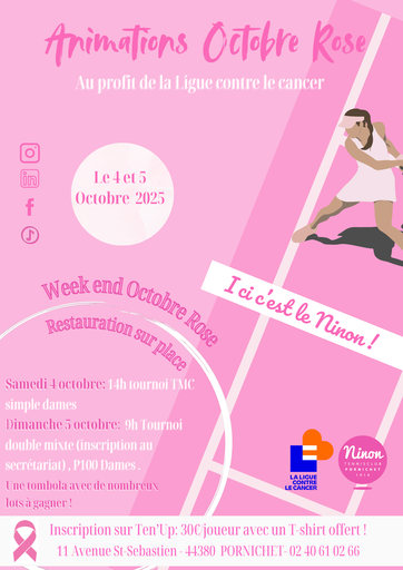 Le NINON Tennis Club de Pornichet a le plaisir d'annoncer que le week-end OCTOBRE ROSE organisé le mois dernier (TMC 100% féminin, Tournoi de padel, ateliers de sensibilisation), a permis de collecter la somme de 1 200.00€.