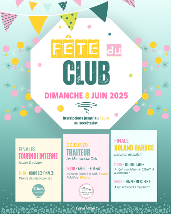 La fin de l'année tennistique approche...Et qui dit fin des cours, des tournois internes et finale de Roland Garros, dit : FÊTE DU CLUB !